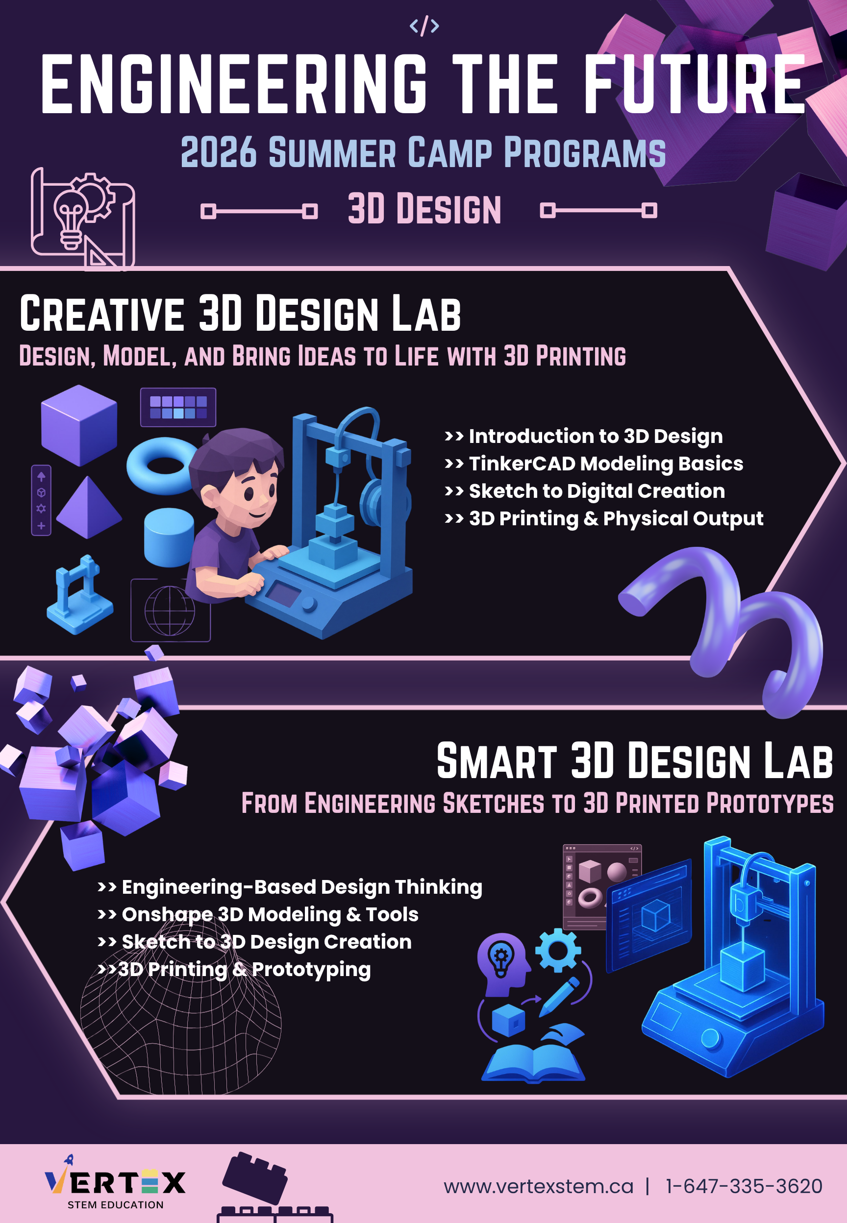 Program Overview: The Smart 3D Design Lab is a two-week advanced STEM program that focuses on 3D design, engineering principles, and digital fabrication. This program focuses on transforming students from simple 3D model creators into designers of functional and interactive objects. Rather than only learning software tools, students will explore how design decisions impact usability, mechanics, and user experience. Through a structured design process, students will: Design 3D objects using OnShape; Prototype and refine their models for real-world 3D printing; Apply mechanical design concepts such as structure, movement, and assembly; Optimize designs for strength, efficiency, and printability. This program emphasizes hands-on creation, problem-solving, and iterative design thinking, giving students a complete “idea-to-product” experience.