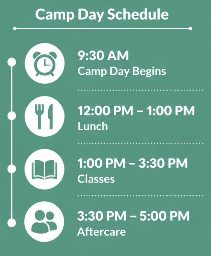 The camp day begins at 9:30 AM. Lunch is scheduled from 12 PM to 1 PM. Classes resume at 1 PM and continue until 3:30 PM. Aftercare is available from 3:30 PM to 5:00 PM for an additional fee. If a child does not bring lunch, one can be provided for $10 per day. In addition, Vertex STEM Education will host a pizza lunch party every Friday.