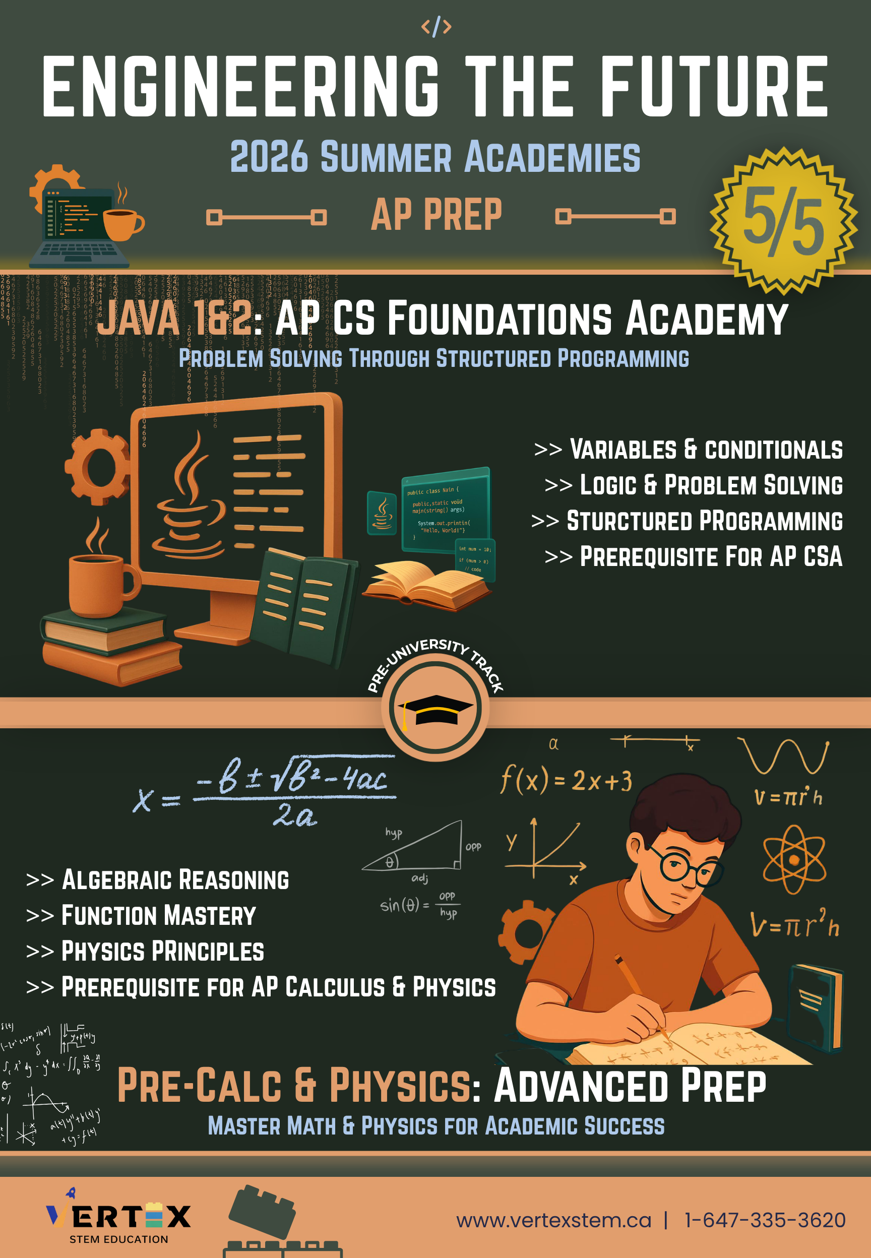 Program Overview: This program is designed to help students prepare for upcoming math and science courses by strengthening their understanding of key pre-calculus and physics concepts. Students will review important topics such as functions, algebraic reasoning, and foundational physics principles in a structured and supportive environment. The course aims to build both confidence and problem-solving skills, allowing students to approach more advanced school material with a stronger foundation. Through guided practice and clear explanations, students will reinforce their understanding while developing the skills needed to succeed in future academic courses.