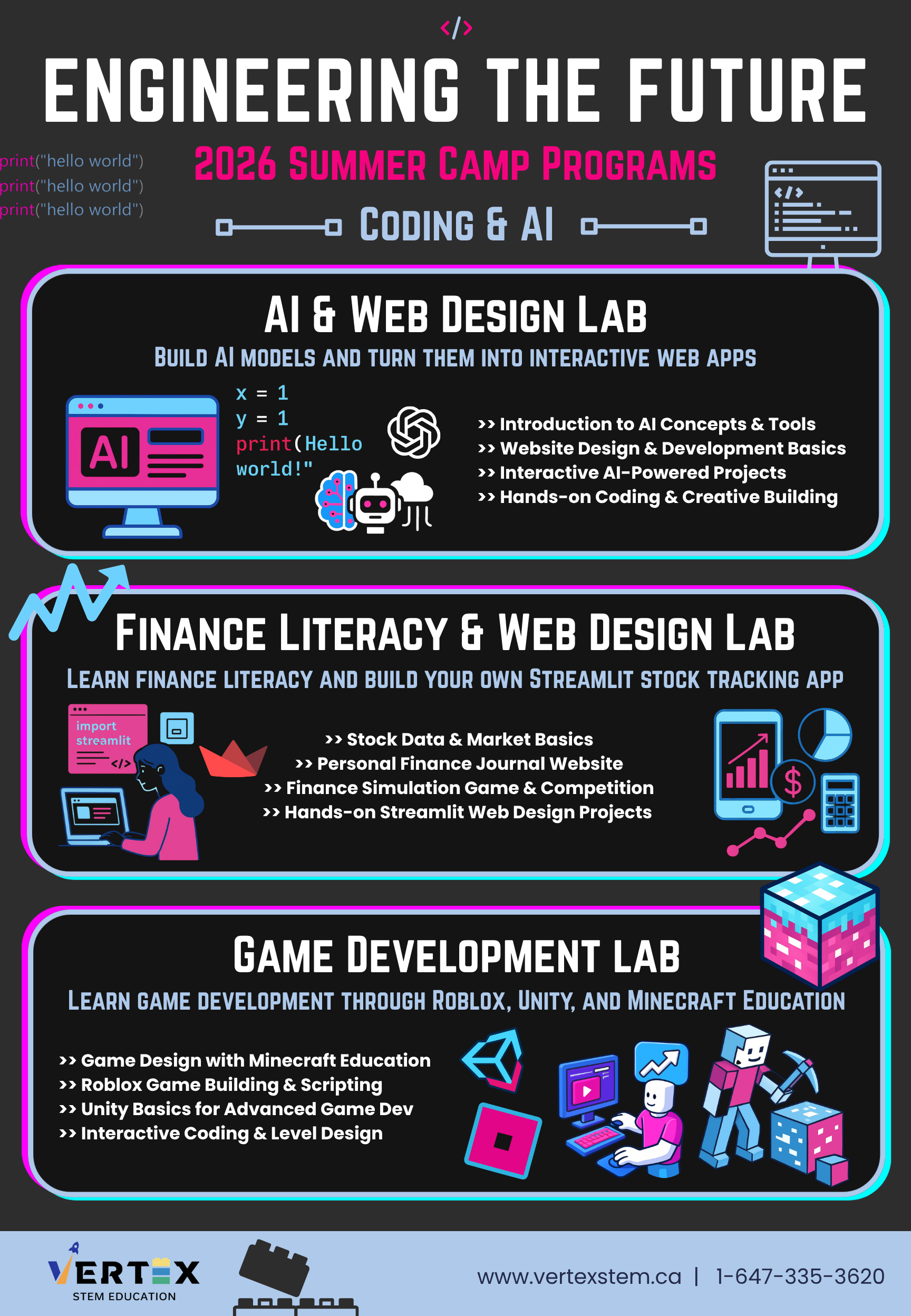 To differentiate these camps from regular classes, Vertex offers a wide range of engaging and interactive programs, which are organized into five main categories: 1) Game Design, 2) Coding, 3) Pre-University Prep, 4) 3D Making, and 5) Lego Robotics. All camp programs are listed below under their respective categories. Each category includes programs at different levels, ranging from beginner to advanced. More detailed information is available under the “Program Overview” for each individual program.