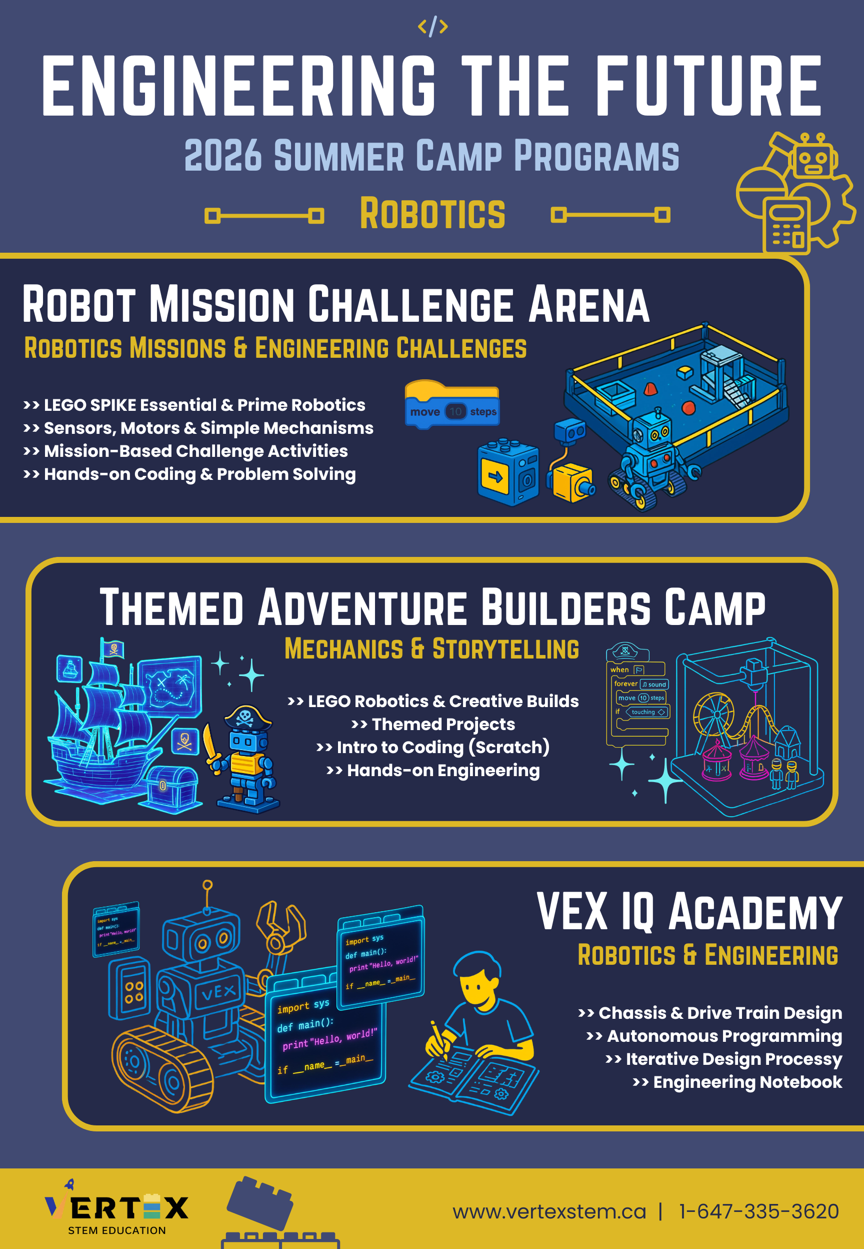 Vertex STEM Education is a STEM learning centre for students ranging from SK to Grade 11 (and potentially Grade 12). The centre offers a variety of STEM programs, including Python, Java, and C++ coding, 3D printing, calculus and physics, Engineering Design, game development, and robotics. Many of these programs utilize hands-on materials such as LEGO robotics and SPIKE kits, Arduino, 3D printers, robotic components, and Raspberry Pi etc.