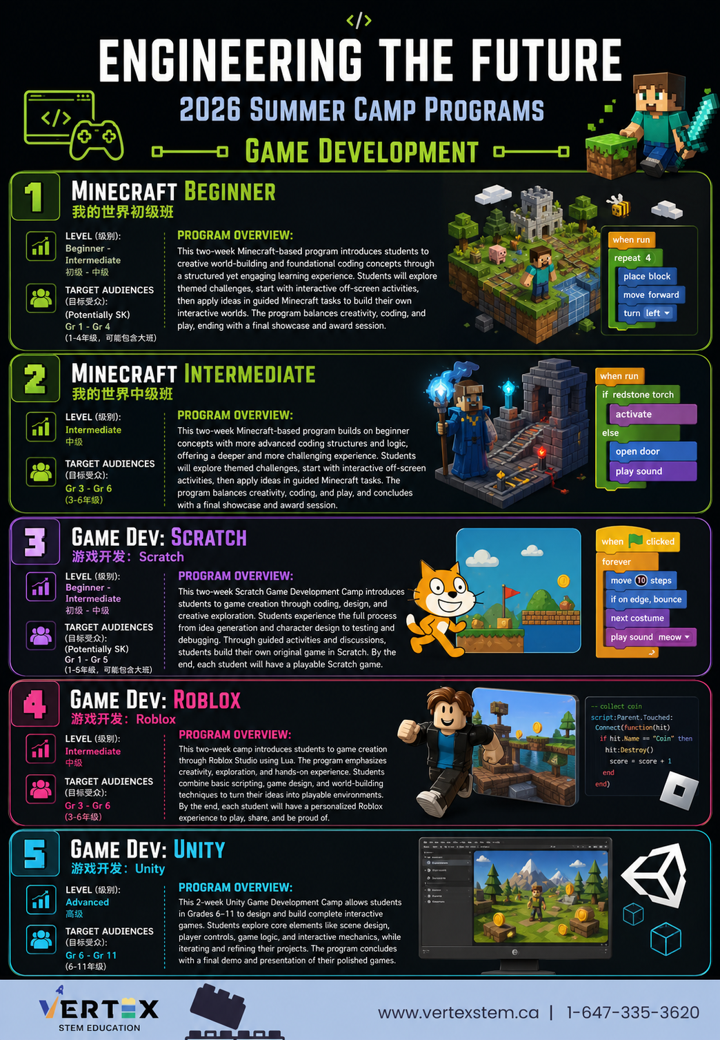 To differentiate these camps from regular classes, Vertex offers a wide range of engaging and interactive programs, which are organized into five main categories: 1) Game Design, 2) Coding, 3) Pre-University Prep, 4) 3D Making, and 5) Lego Robotics. All camp programs are listed below under their respective categories. Each category includes programs at different levels, ranging from beginner to advanced. More detailed information is available under the “Program Overview” for each individual program.